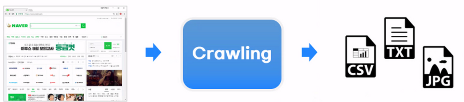 웹 페이지를 탐색하고 그 정보를 가져와 추출 및 가공하는 것즉, 웹(Web)에 있는 데이터를 수집해서 저장하는 일련의 과정